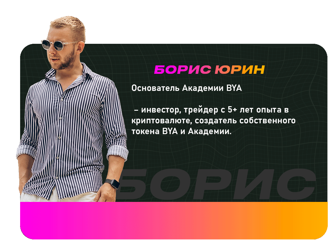 Академия трейдинга и арбитража BYA - это теоретическое и практическое обучение состоящее из 4-х крупных блоков в криптоиндустрии: Основы криптовалют, биржи, арбитраж криптовалют, трейдинг, NFT, токенизация.